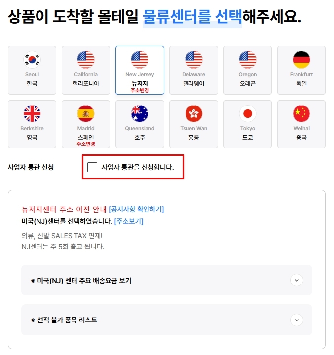 배송신청서 작성 시 센터를 선택할 때 ‘사업자 통관 신청’ 항목에 체크되어 있는 경우,