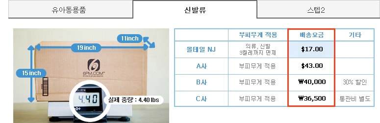 타사대비 부피무게 비교