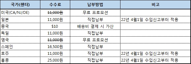 | 제목 | [공지] 국가별/센터별 사업자 통관수수료 안내 | 등록일 | 2022-03-16 |
