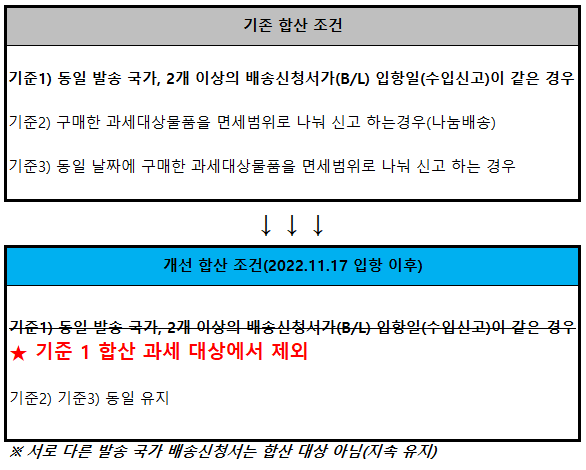 적용일 : 2022년 11월 17일 입항건(수입신고) 이후 적용내용 : 동일 발송 국가, 2개 이상의 배송신청서 입항일 동일한 경우 합산 과세 제외