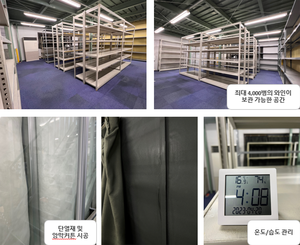 넓은 공간에 외부 온도의 영향받지 않는 단열재 시공, 외부 직사광선 완벽 차단 시설과 철저한 온도 및 습도 관리 및 모니터링할 수 있는 보관 환경을 제공합니다.