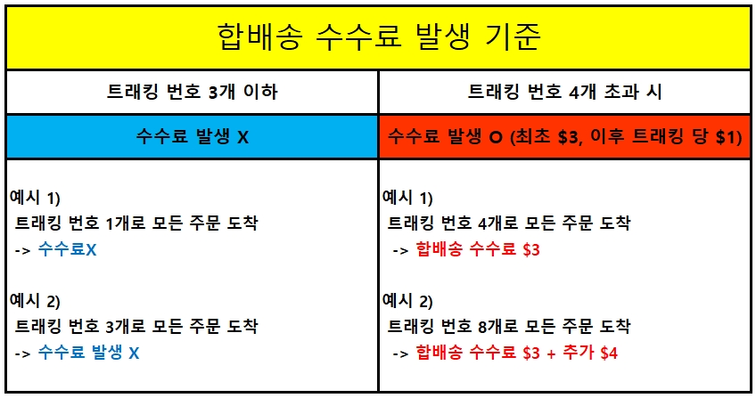 합배송이란? 하나의 배송신청서에 2개 이상의 트래킹 번호로 도착하는 케이스 입니다. 타사의 경우 2개 이상부터 수수료를 부과하기도 하나 , 4개부터 수수료를 부과하는것으로 결정하였습니다.